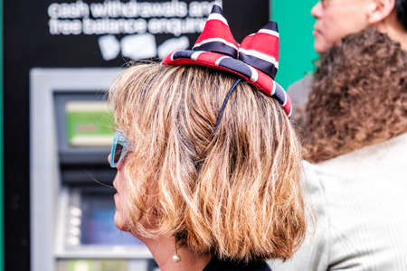 Epsom Surrey, London UK, June 04 2022, Woman With Short Blonde Hair Wearing Union Jack Novelty Hat