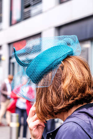 Epsom Surrey, London UK, June 04 2022, Close Up Woman Wearing Turquoise Fascinator Hat With Netting