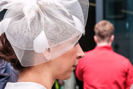 Epsom Surrey, London UK, June 04 2022, Side Profile Head Shot Young Woman Wearing Fascinator Hat