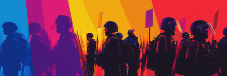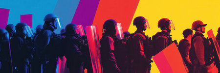 Crowds rally with placards demanding justice while law enforcement in riot gear stands ready, reflecting societal tensions and struggles for rights.