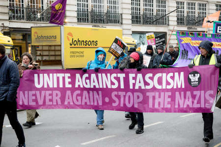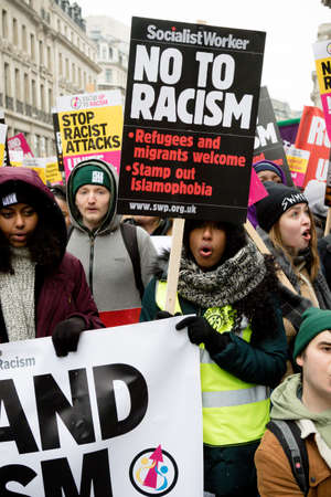 London, United Kingdom, 17th March 2018:- The Stand Up to Racism march through central London from the BBC to outside Downing Street