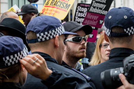 London, United Kingdom, August 3rd 2019:- Anti fascist demonstrators march in opposition to a rally by supporters of the former EDL leader Tommy Robinson