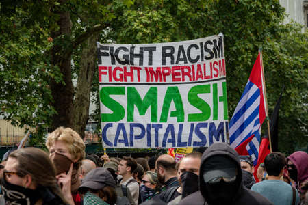 Westminster, London | UK - 2021.05.01: People wearing masks and waving flags and banners at Kill the Bill protest.