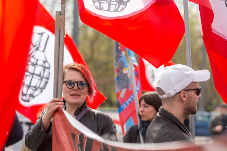 MOSCOW, RUSSIA - MAY 1, 2016: Unidentified National Bolsheviks, together with Communist party supporters take part in a rally marking the May Day in the center of Moscow.