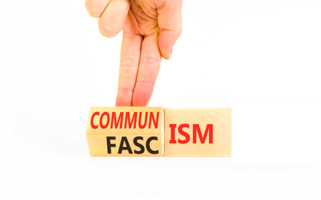 Communism or fascism symbol. Concept words Fascism to Communism on beautiful wooden cubes. Beautiful white table white background. Business historical and communism or fascism concept. Copy space.
