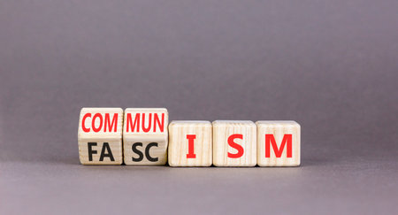 Communism or fascism symbol. Concept words Fascism to Communism on beautiful wooden cubes. Beautiful gray table gray background. Business historical and communism or fascism concept. Copy space.