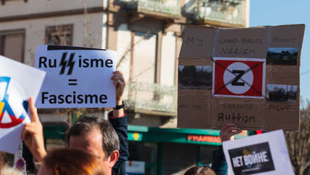 War in Ukraine support with poster, Strasbourg, France, Russian consulate February 2022