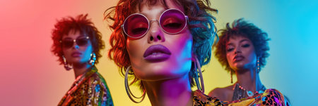 Fashion models showcase vibrant outfits in a studio setting with colorful lighting