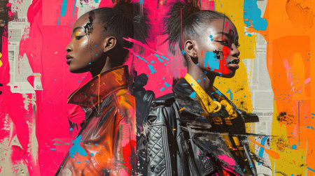 High-Fashion Fusion Collage: Chic Poses with Abstract Paint and Magazine Fragments on a Monochromatic Neon Background