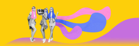 Image collage picture of positive funky happy girls listening music radio playlist have fun together isolated on painted background