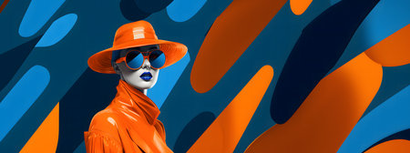 Fashionable woman in orange hat and sunglasses. 3d rendering. Beauty, fashion. Advertisement concept with wide copy space for text.