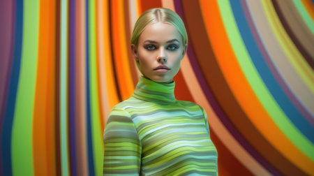 Young female model posing with trendy fashion outfit and colorful green optical art abstract background. Picturesque generative AI