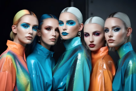 Group of young beautiful women in futuristic costumes with bright makeup. Fashion of future concept.