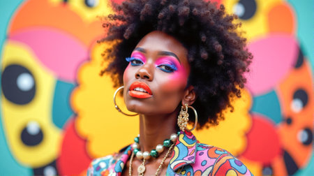 In a lively urban setting, a black woman poses confidently, showing striking makeup featuring bright colors and bold jewelry. The colorful mural behind adds visual energy.