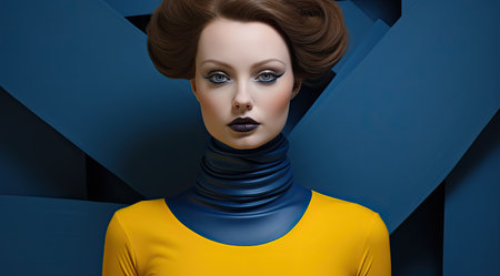 Fashionable young woman looking at camera while standing against vibrant banner : Generative AI