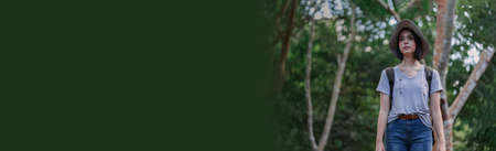 Forest hike trail hiker woman walking in autumn fall nature background in fall season. Young Caucasian woman hiking active people lifestyle wearing backpack exercising outdoors.