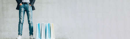 Man shopping. Consumerism hobby leisure. Guy in jeans standing with paper bags on gray background.