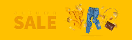 Autumn sale. Fall shopping. Yellow flying womens knitted sweater, blue jeans, leather bag, golden autumn leaves on yellow background. Creative clothing concept, discounts in stores. Flat lay fashion