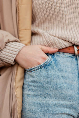 Women's clothing look style with vintage beige sweater and light blue classic jeans. Girl in a fashionable outfit