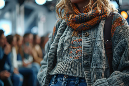 Closeup of Woman Wearing a Knitted Cardigan and Scarf in a Crowded Indoor Setting