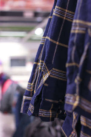 Mens blue plaid shirts on hangers in the store