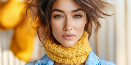A young woman poses with a confident expression showcasing her style with a vibrant yellow scarf. Her hair flows freely creating an effortless look in a warm and inviting atmosphere.