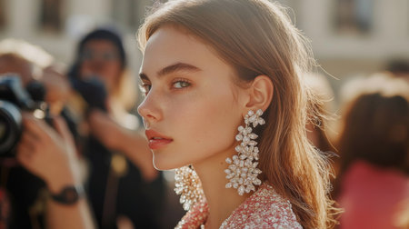 A model showcasing a pair of statement earrings at a fashion event, surrounded by photographers and onlookers, emphasizing the role of jewelry in fashion and style.