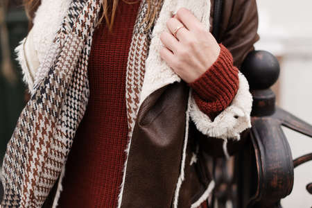 Sleeve and collar of a jacket close-up. Girl in winter clothes.