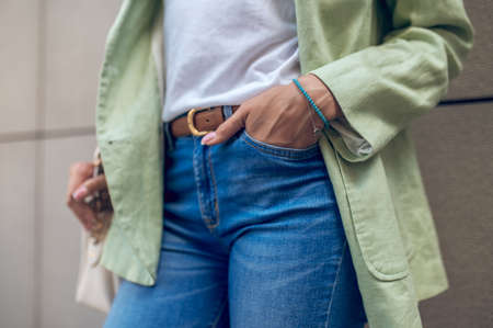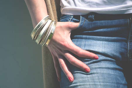 Leather ethnic braided bracelets on woman wrist close up, hippie woman wearing jeans, denim jacket and boho accessories on a hand, bohemian style