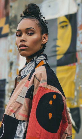 Explore urban style with this striking portrait capturing a modern fashion statement against an artistic backdrop. The fusion of patterns and bold colors creates an edgy visual appeal. Generated A.I.
