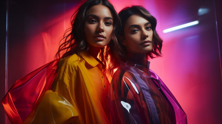 An AI generated illustration of Two stylish young women posing together in brightly-colored neon clothing, looking happy and confident