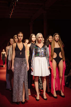 ASTRAKHAN RUSSIA - NOVEMBER 01, 2019. Caspian Fashion Week.A woman model walks the red runway.Fashion show,catwalk event,runway show.
