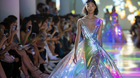 Holographic Couture: A model showcasing a stunning holographic garment on the runway, illustrating the fusion of technology and fashion in a futuristic design.