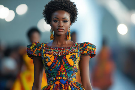 A fashion model walks confidently down the runway, wearing a striking outfit that features bright colors and intricate patterns drawn from African culture. The evening atmosphere complements the lively designs and elaborate accessories.