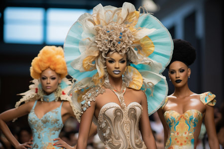 Fashion show.Gorgeously beautiful womans catwalk colorful extravagant outfits.Digital creative designer fashion glamor art.