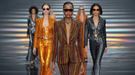 Models wearing colorful and sparkly suits are walking down the runway during a fashion show