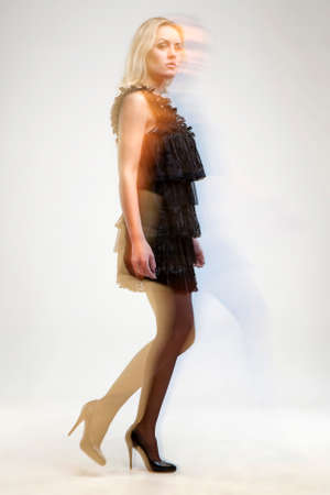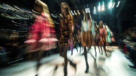Fashion models walking on catwalk during fashion show rehearsal with motion blur effect