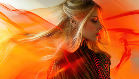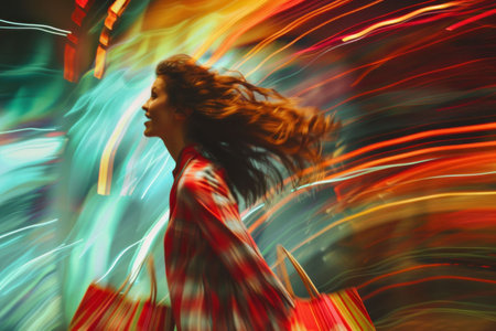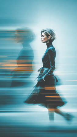 A woman is captured with a motion blur effect that creates a surreal visual. The background features soft lighting, enhancing the artistic atmosphere of the moment.
