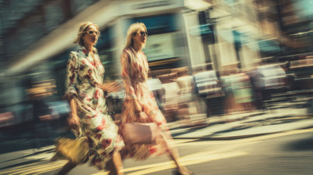 Two women wearing fashionable floral dresses rush across a bustling city street, carrying designer bags while sunlight creates a vibrant atmosphere.