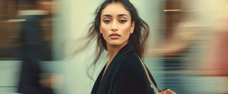 In a bustling city a young woman with flowing hair strolls past blurred figures exuding confidence. Her stylish look captures the essence of urban life during the vibrant autumn season.