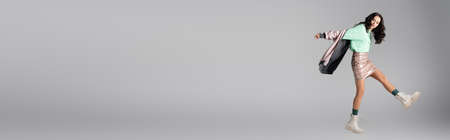 brunette young woman in stylish winter outfit posing on gray background, banner