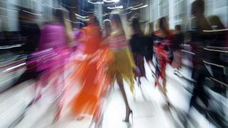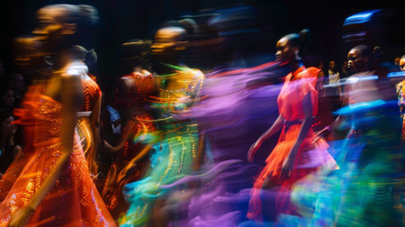 A group of women in colorful dresses are walking down a runway. The image is blurred and has a sense of motion, giving it a dynamic and energetic feel. The women are dressed in various colors