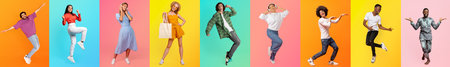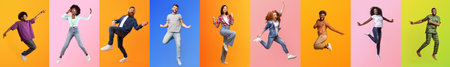 Diverse individuals joyfully jumping in a colorful background collage