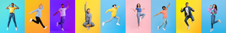 Dynamic collage of diverse people jumping in colorful backgrounds