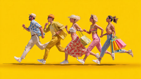 Group of people with shopping bags running on a yellow background. Shopping concept.