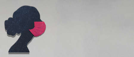 An abstract piece in the shape of a woman wearing a surgical mask on a textured fabric background. Medical concept and horizontal image.