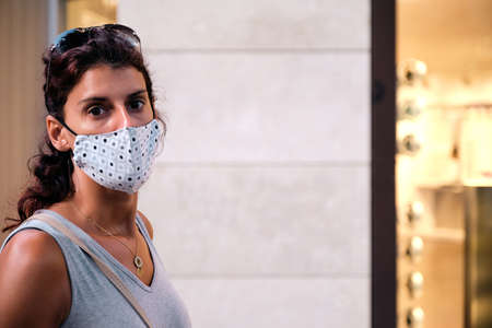 Young woman wearing a protective surgical face mask during the Coronavirus disease (COVID-19) outbreak epidemic. Close up portrait with a multiple use white protection mask on the face.