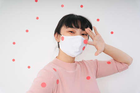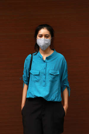Masked Asian woman prevent germs and wear blue shirt. Tiny Particle or virus corona or Covid 19 protection. Concept of Combating illness.