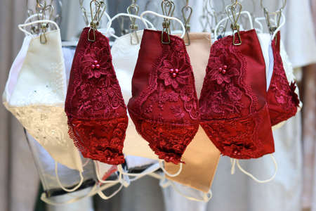 Lace fabric washable reusable fashion face masks hanging on clothes hanger. Making DIY cloth mask to prevent the outbreak of the Covid-19 virus has become a popular fashion throughout Thailand.