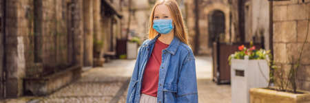 BANNER, LONG FORMAT Young woman wearing a medical mask during pandemic tourist walks down the street in a European city
